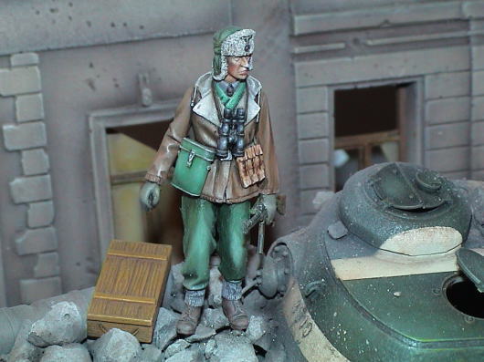 タミヤ/ティーガーUとドラゴン/JSU 破壊されたJSとティーガーという しごくありがちな構図の作品。2001年。 フィギュアはバーリンデン、 初めて油彩を使ってみた。 塗装だけは気に入ったので それから油彩を使うようになった。 この作品で初めて情景を作ってみたのだけど どんな風に作っていいものやら 手探りで始めたから 後半はかなり失速してしまった。 それでも2001年の九州AFVの会で銀賞を もらった。 |