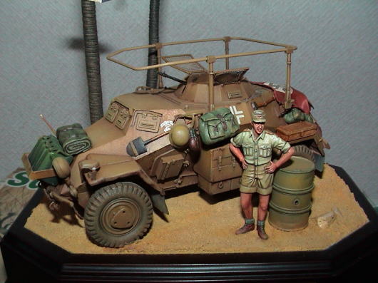 タミヤ/sd.kfz222 2002年の九州AFVの会のテーマ(砂漠)で 作った作品。 前年の賞の景品でもらったキットを使用した。(笑) 箱絵風に塗装してみようとがんばった記憶が…。 フイギュアはタミヤ/アフリカキューベルに 付属のもの。 アフリカの日差しを表現しようと 影をかなり強く入れた。 |
